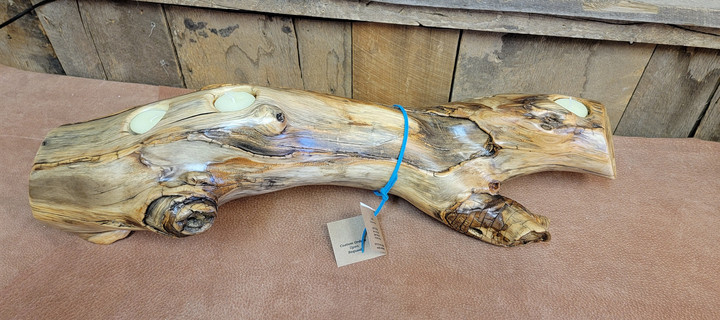 Sherri kept seeing bear faces in the aspen on their property. That's when Mike & Sherri came up with their original aspen bear candleholders and lamps. With just a little touch of the woodburner here and there, other people could see the bears too. Aspen bears are now on most of their art. Most of what they work with comes from South Park in Park County above 10,000 feet. From these, they try to create individual unique items. They also work with various types of pines including bristlecone and beetle kill pine.